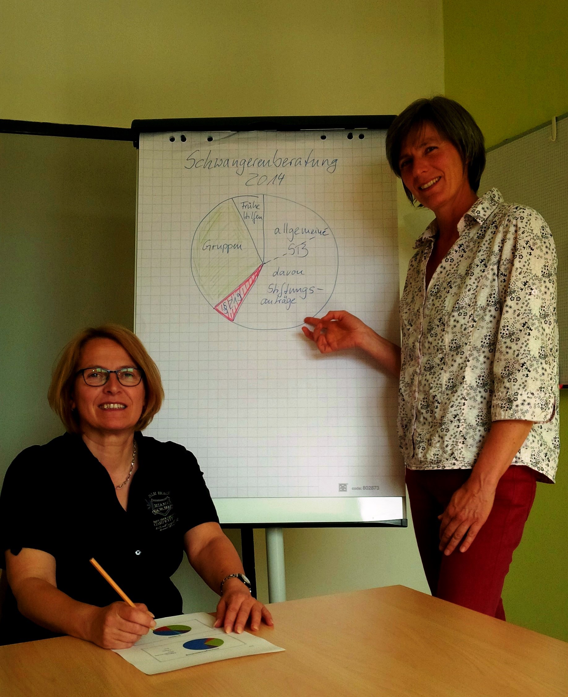 Dipl. Sozialpädagogin und Schwangerenberaterin Anja Scheibel (stehend) und die Leiterin des Diakonischen Werks Odenwald, Bärbel Simon bei der Präsentation des Jahresberichtes der Schwangerenberatungsstelle