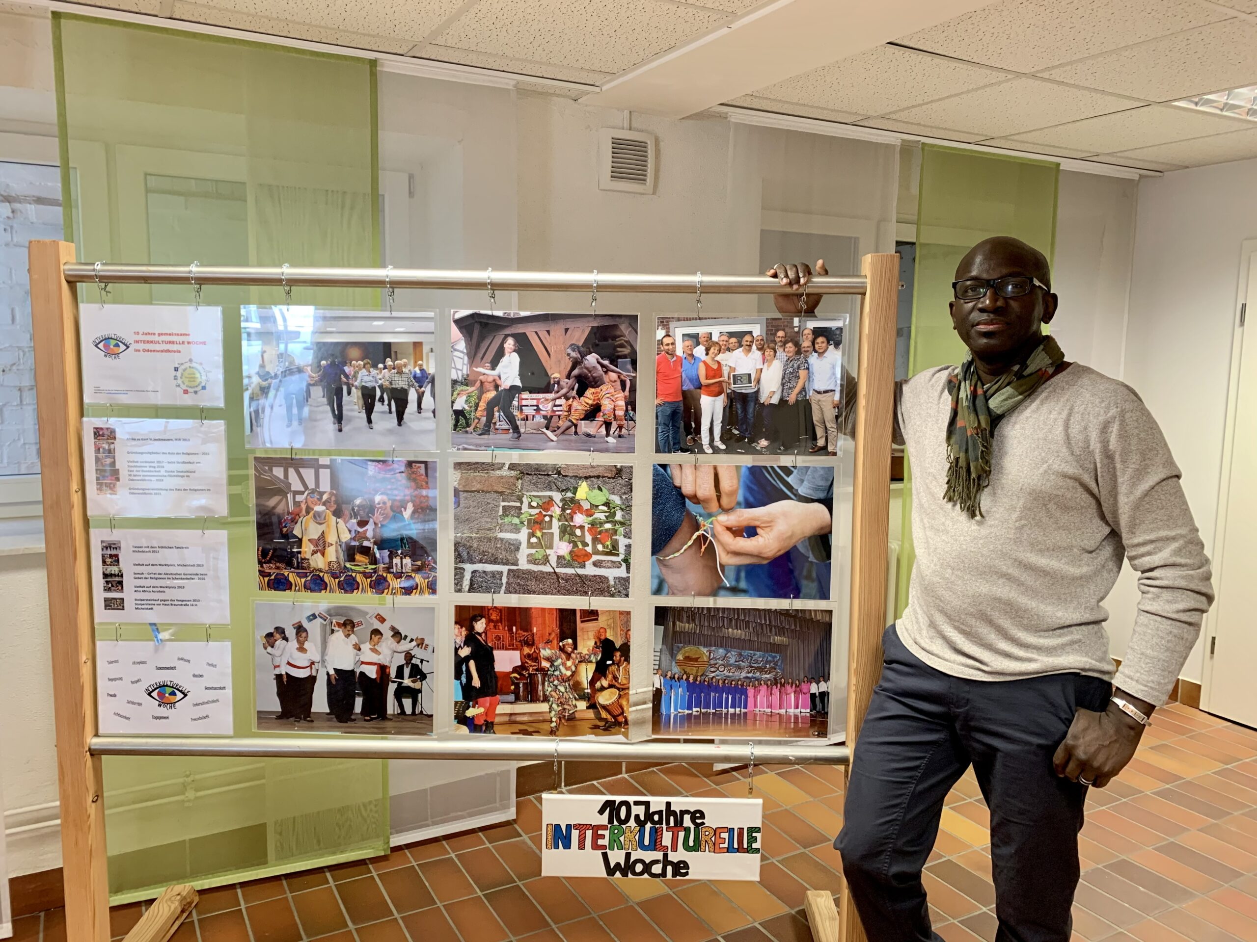 Das Foto zeigt Aristide Sambou vom Diakonischen Werk Odenwald neben Fotos von verschiedenen IKW-Veranstaltungen der interkulturellen Wochen aus den letzten 10 Jahren.