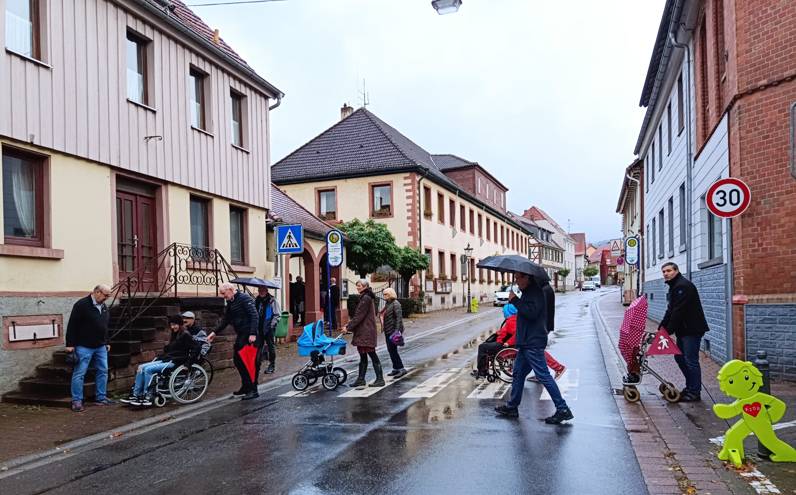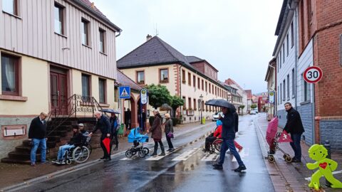 Die Ansammlung von Rollstühlen im verregneten Fränkisch-Crumbach am vergangenen Samstag war auffällig – und hatte einen Grund: der Behindertenclub Odenwald hatte dazu eingeladen, den historischen Ortskern auf seine Barrierefreiheit zu überprüfen und einige zentrale Punkte mit Rollstühlen und Rollatoren zu befahren. Auch Bürgermeister Engels konnte sich aus ungewohnter Perspektive einen Eindruck verschaffen, den er als „beeindruckend und augenöffnend“ beschreibt. Am eindrucksvollsten war wohl die Behindertentoilette am Rathaus, die vorbildlich ausgestattet ist – aber deren Tür im Praxistest leider nur unter größten Schwierigkeiten zu öffnen ist. Auch die gut gedachten niedrigen Bordsteinkanten am Zebrastreifen sind für Rollstuhlfahrer schwer zu überwinden, noch dazu, wenn sich das Vorderrad im Gullideckel festklemmt. An der Bushaltestelle bei der Volksbank erweist sich der Abfalleimer als Behinderung auf dem Bürgersteig.