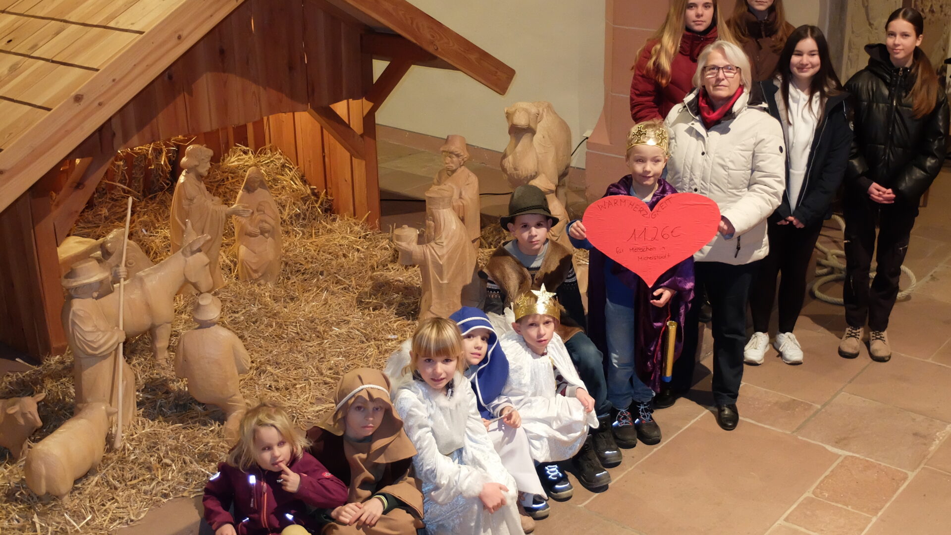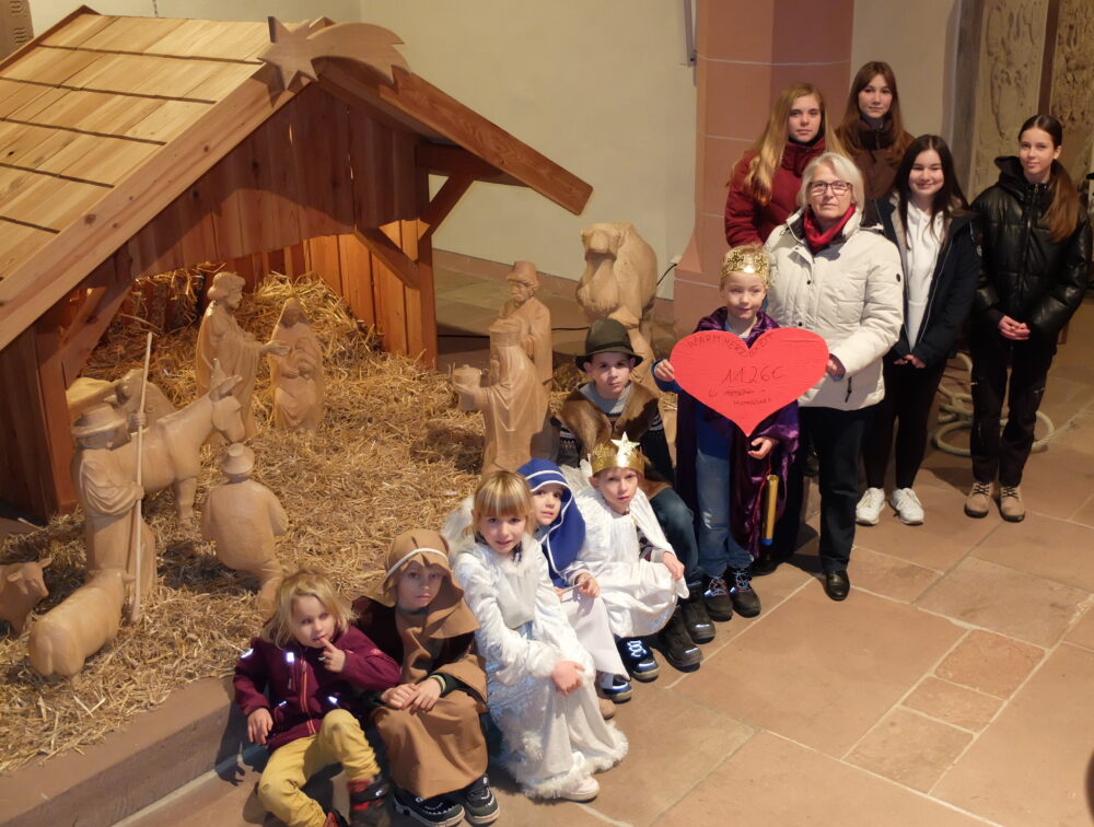 An der Krippe in der Stadtkirche wird das Thema Warmherzigkeit sinnfällig – Spendenübergabe von Krippenspielkindern und Konfirmandinnen an Bärbel Simon, Leiterin des Diakonischen Werks Odenwald.