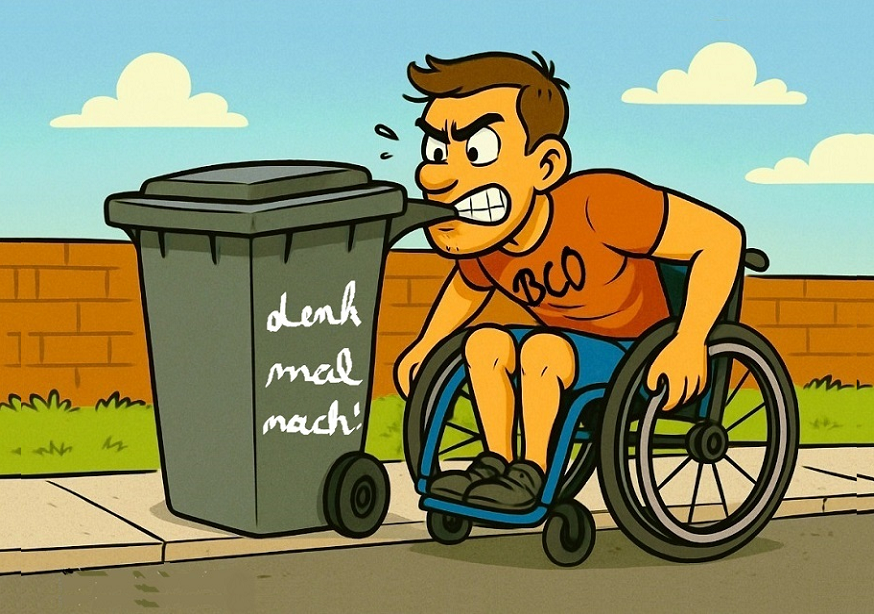 Wer einen Aktivrollstuhl fährt, braucht beide Hände an den Rädern – sonst ist eine Fortbewegung kaum möglich. Wird der Gehweg jedoch durch achtlos abgestellte Gegenstände wie Mülltonnen blockiert, bleibt Menschen mit Mobilitätseinschränkungen oft nur die gefährliche Ausweichmöglichkeit auf die Fahrbahn.